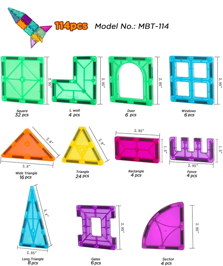 | Item No.: MBT-114 114pcs Magnetic Building Tiles Toy set | 32pcs Square + 4pcs L Wall + 6pcs Door + 6pcs Windows + 16pcs Wide Triangle + 24pcs Triangle + 4pcs Retangle + 4pcs Fence +8pcs Long Triangle + 6pcs Gates + 4pcs Sector |